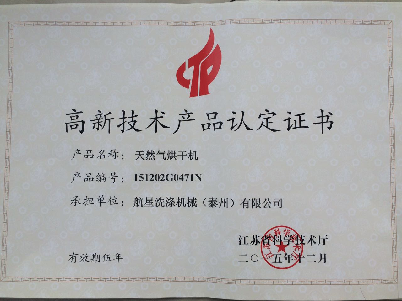 高新證書-天然氣烘干機